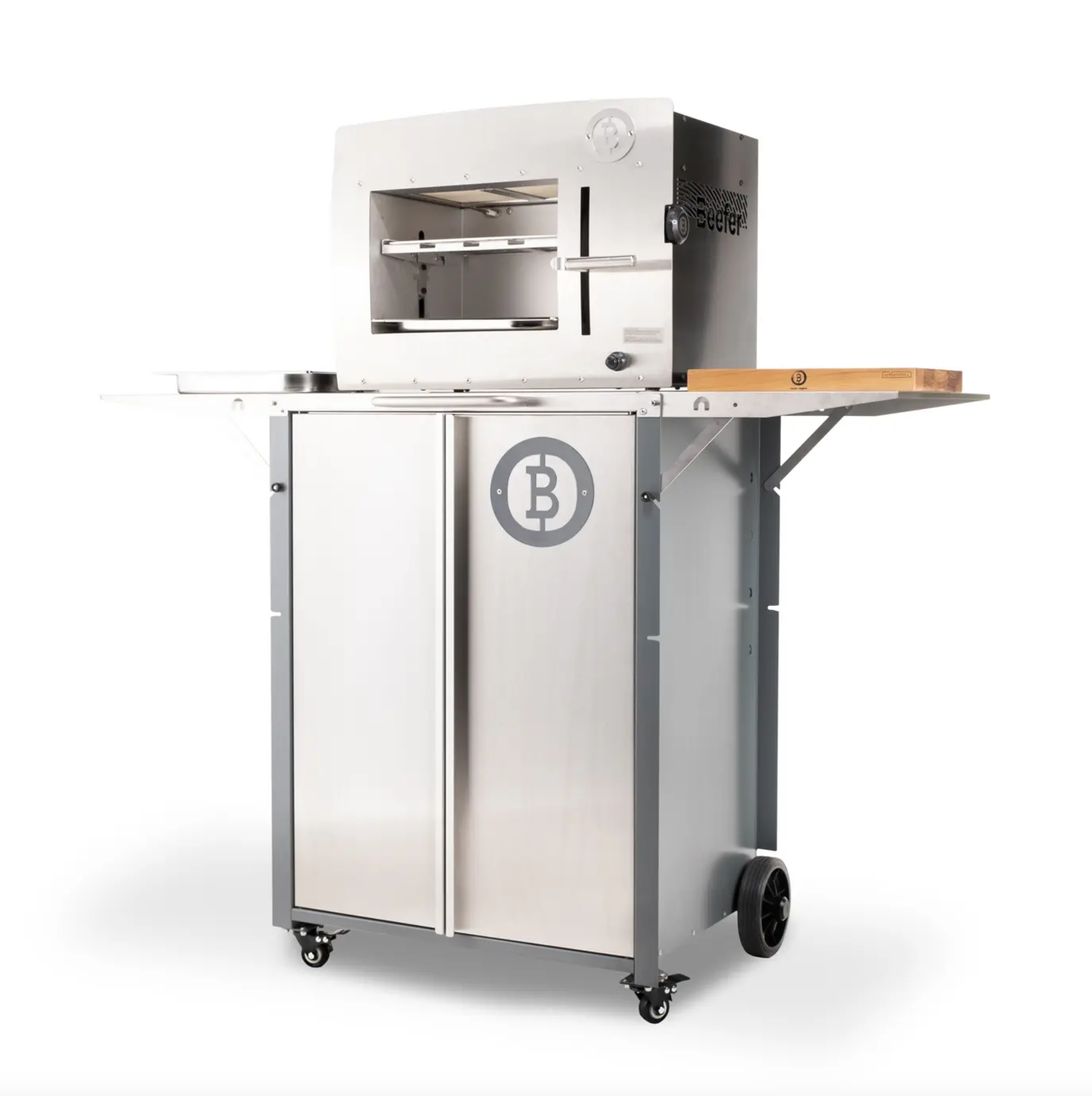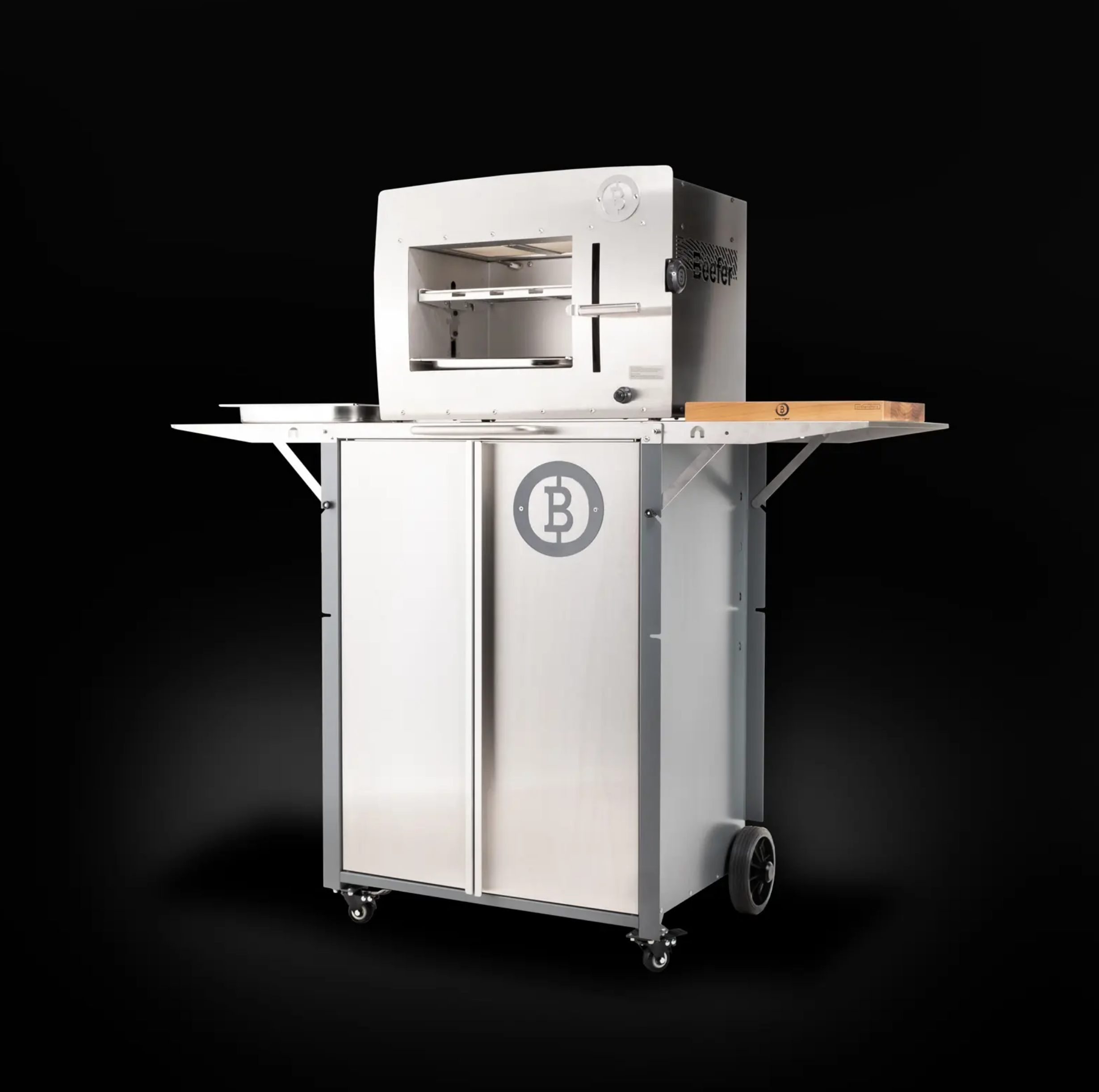 Gehäuse aus Edelstahl bzw. Stahl pulverbeschichtet. Türen mit Magnetverschlüssen an der Vorderfront, praktisches Staufach für Gasflasche und Zubehör. Der Wagen ist mit Lenk- / Lenkbremsrollen ausgestattet, sodass Du ihn sicher parken kannst, wenn Du Freunde, Familie oder Kunden mit dem Beefer® beglückst. Seitlich links befindet sich praktischerweise eine ausziehbare Ablage aus Edelstahl, z.B. für Dein Schneidebrett, die Reling rechts über Eck dient als Handtuchhalter und Griff. An der Rückwand hast Du eine Ablage für zwei Roste, darunter für eine Schale. Rechts befindet sich eine Arbeitsfläche zum Vorbereiten, Tranchieren, etc.