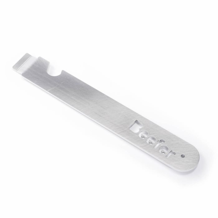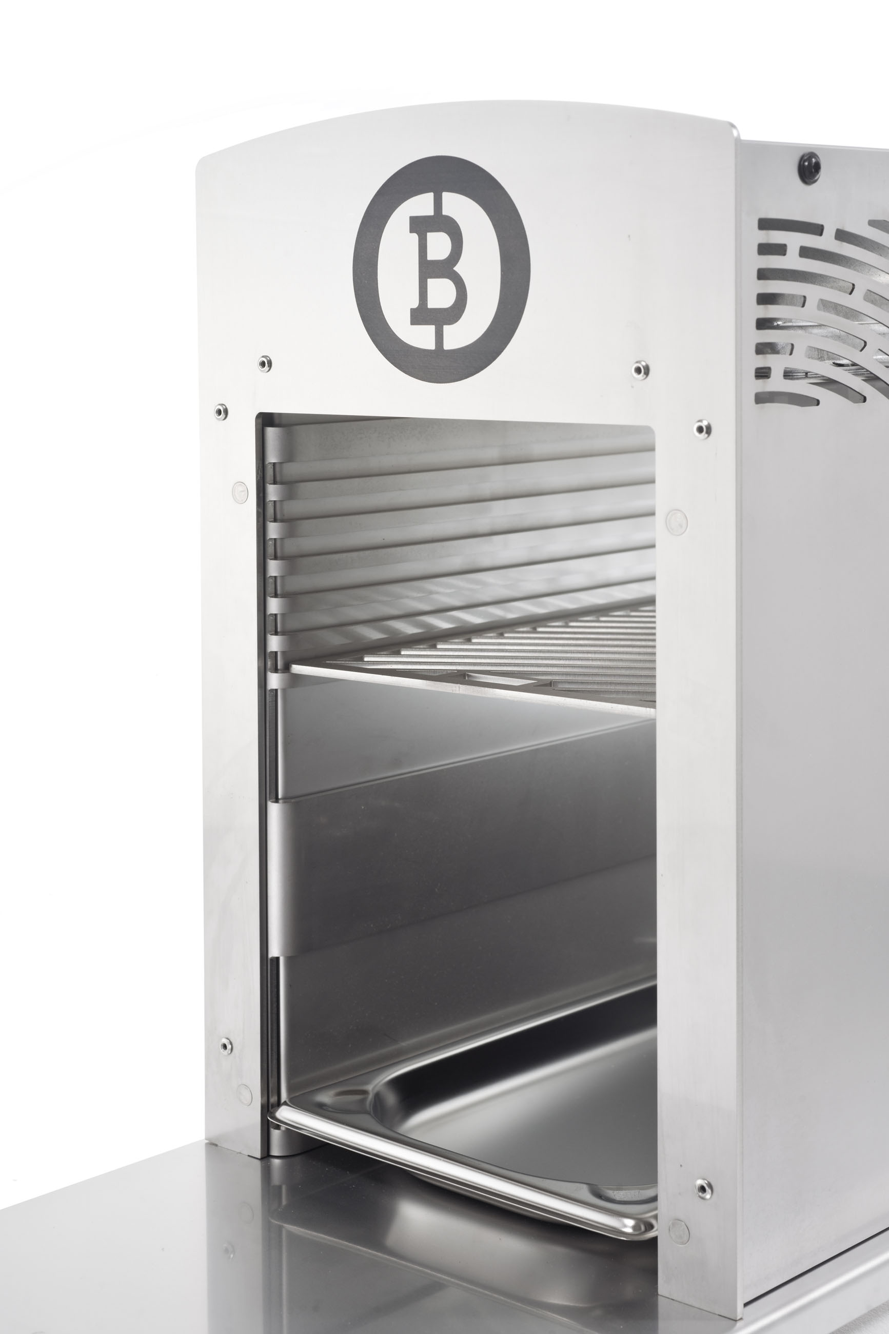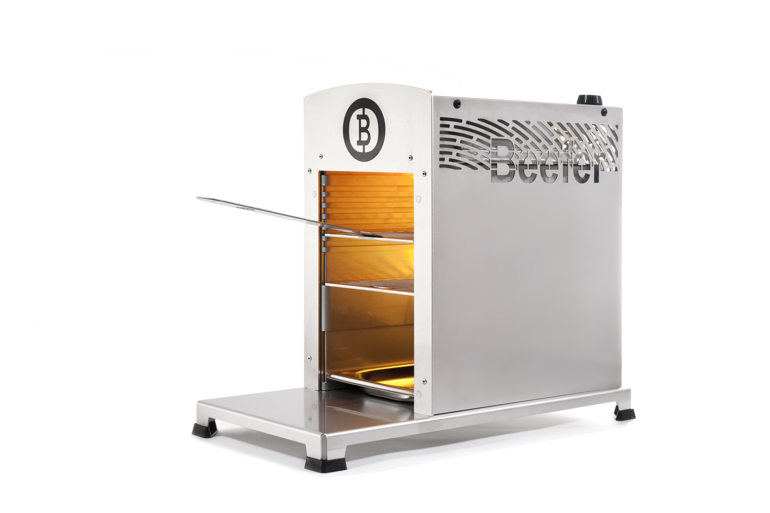 Beefer® works exclusively with top heat and achieves temperatures of > 1,500° F that are previously unknown for conventional grills on the market. This is made possible by a ceramic high-performance gas burner. Besides the short cooking time that enables the exact degree of cooking to be set, a particular advantage of the Beefer®® is how the top heat causes meat juices to drip below. The juices are then caught in the gastro tray and can be used to prepare delicious sauces.