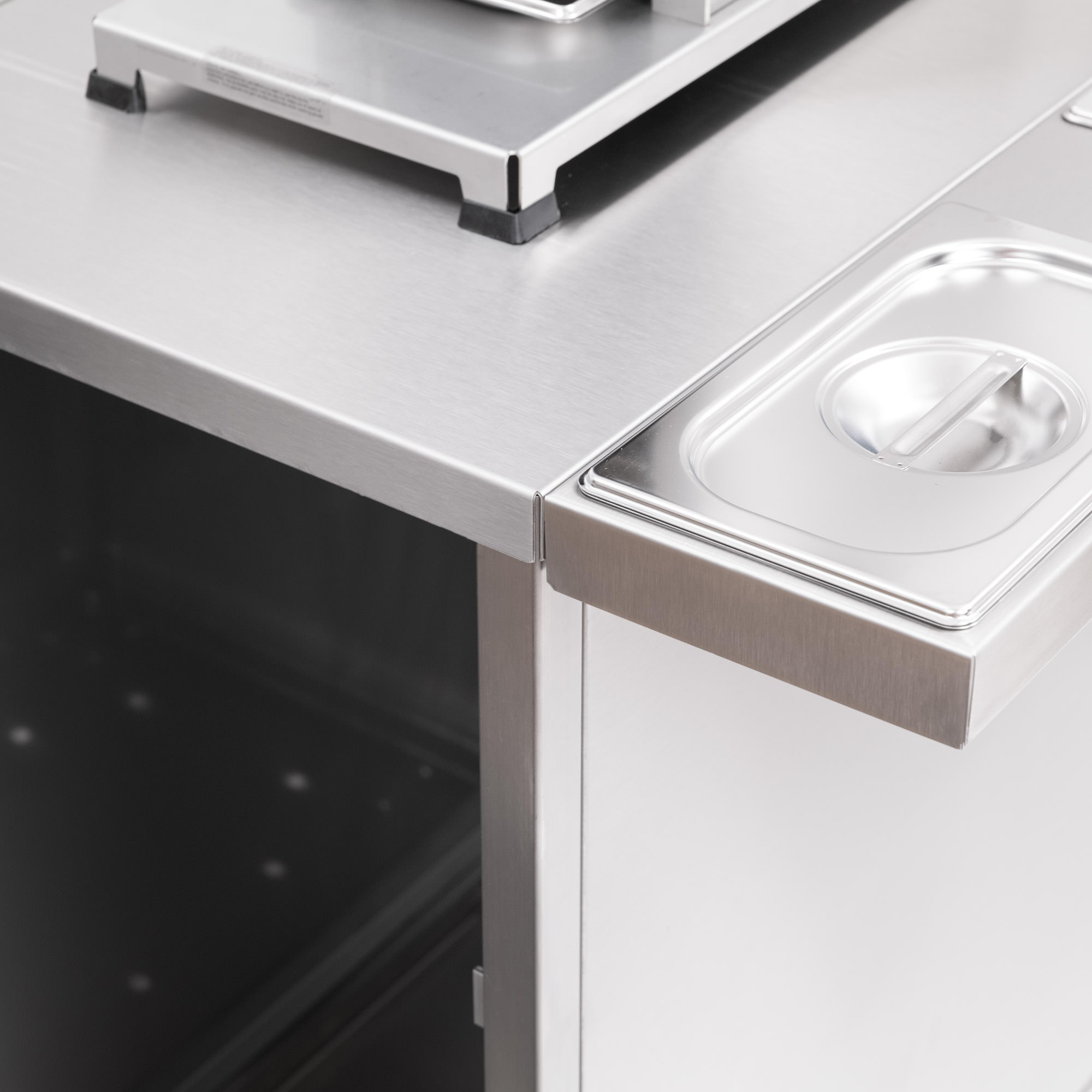 Le chariot Beefer Small peut être agrandi en un clin d’œil. Des extensions sont disponibles pour chaque côté : une tablette latérale ou un support pour bacs GN – à vous de choisir. Ou bien combinez les deux ! Les accessoires peuvent être fixés à gauche comme à droite. Prix par extension : 69,00 € TTC.