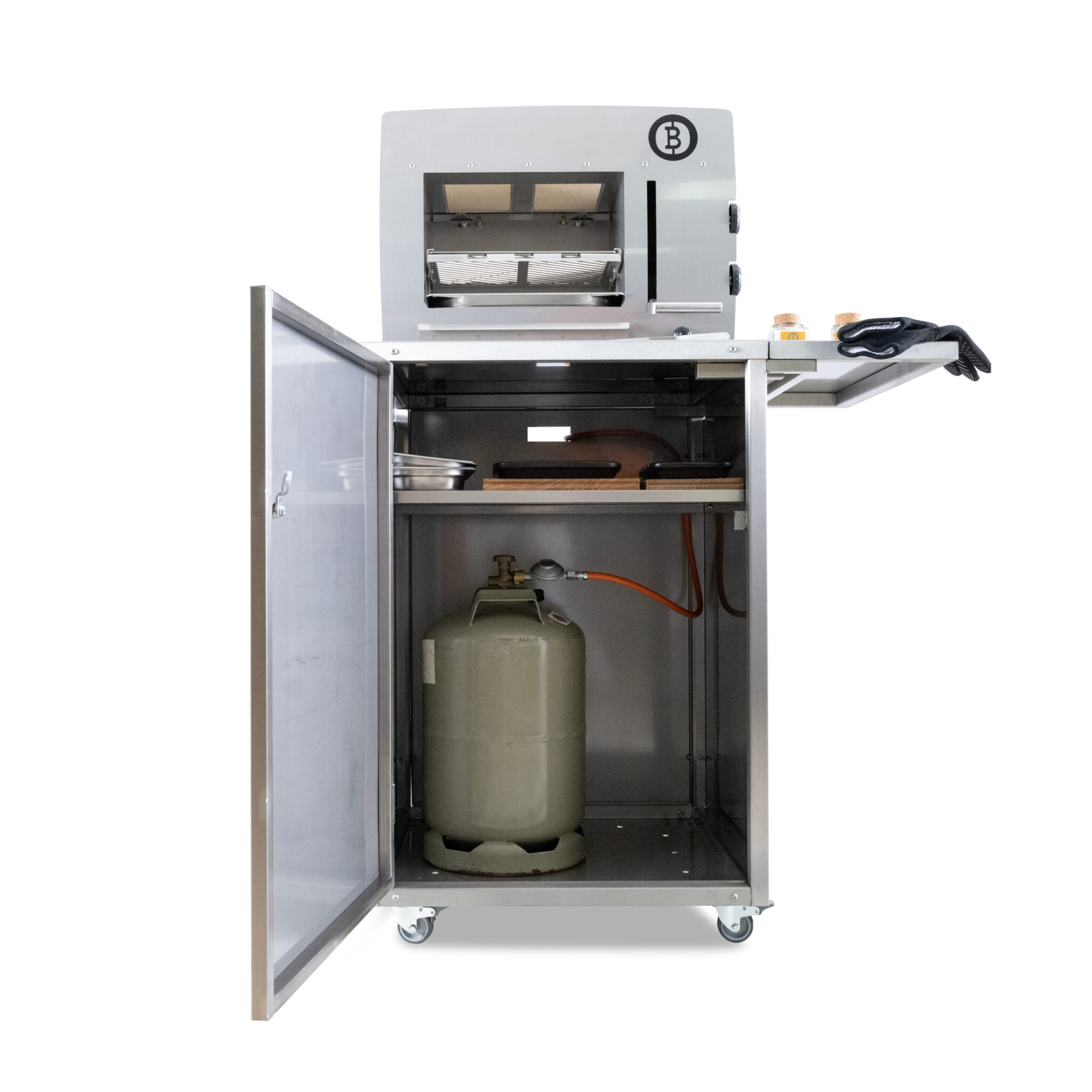 Lorsque les extensions latérales en acier ne sont pas nécessaires, elles se retirent facilement et se rangent à l’intérieur du chariot, avec tous vos accessoires, une bouteille de gaz de 11 kg, ou tout ce que vous aimez garder à portée de main pour sublimer les arômes. Une étagère intérieure (incluse) divise l’espace en deux niveaux, dans un rapport d’environ 25/75 – pour une organisation optimale.